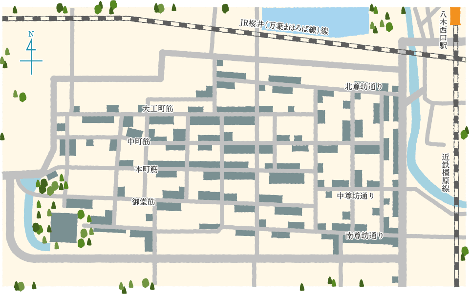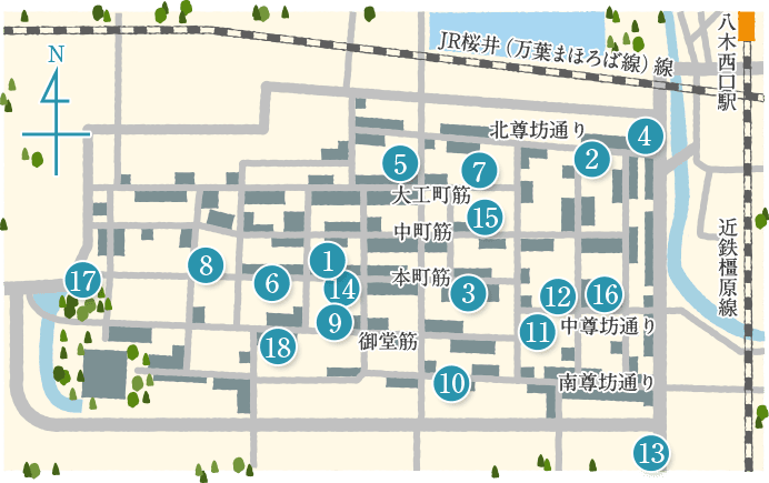 環濠がめぐらされ、城塞都市だった今井町。町の出入口には、東側に3カ所、西側1カ所、南側3カ所、北側2カ所の計9つの門が置かれ、門と町の外をつなぐ木橋が渡されていました。